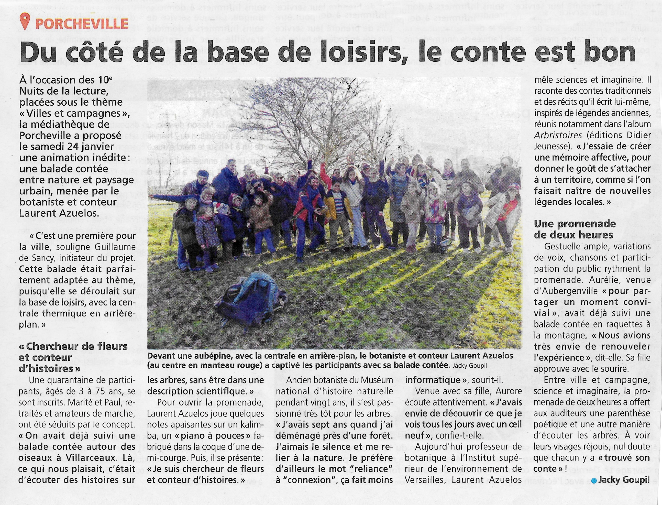 Article de presse de Jacky Goupil suite à une balade botanique contée "Entre ville et campagne" dans Porcheville dans le cadre de la nuit de la lecture le 24 janvier 2026